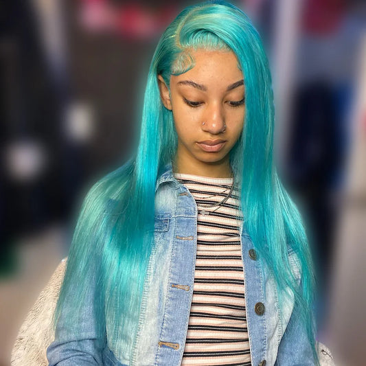 Bone Straight 13x6 Lace Front Human Hair Wigs For Women Light Blue Lace Frontal Wig Pre-Plucking Cyan Green Human Hair Wigs