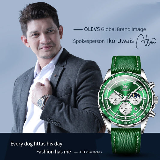 OLEVS Men's Watches Fashion Sports Green Watch For Men Multifunctional Quartz Wristwatches Men Waterproof Leather reloj hombre