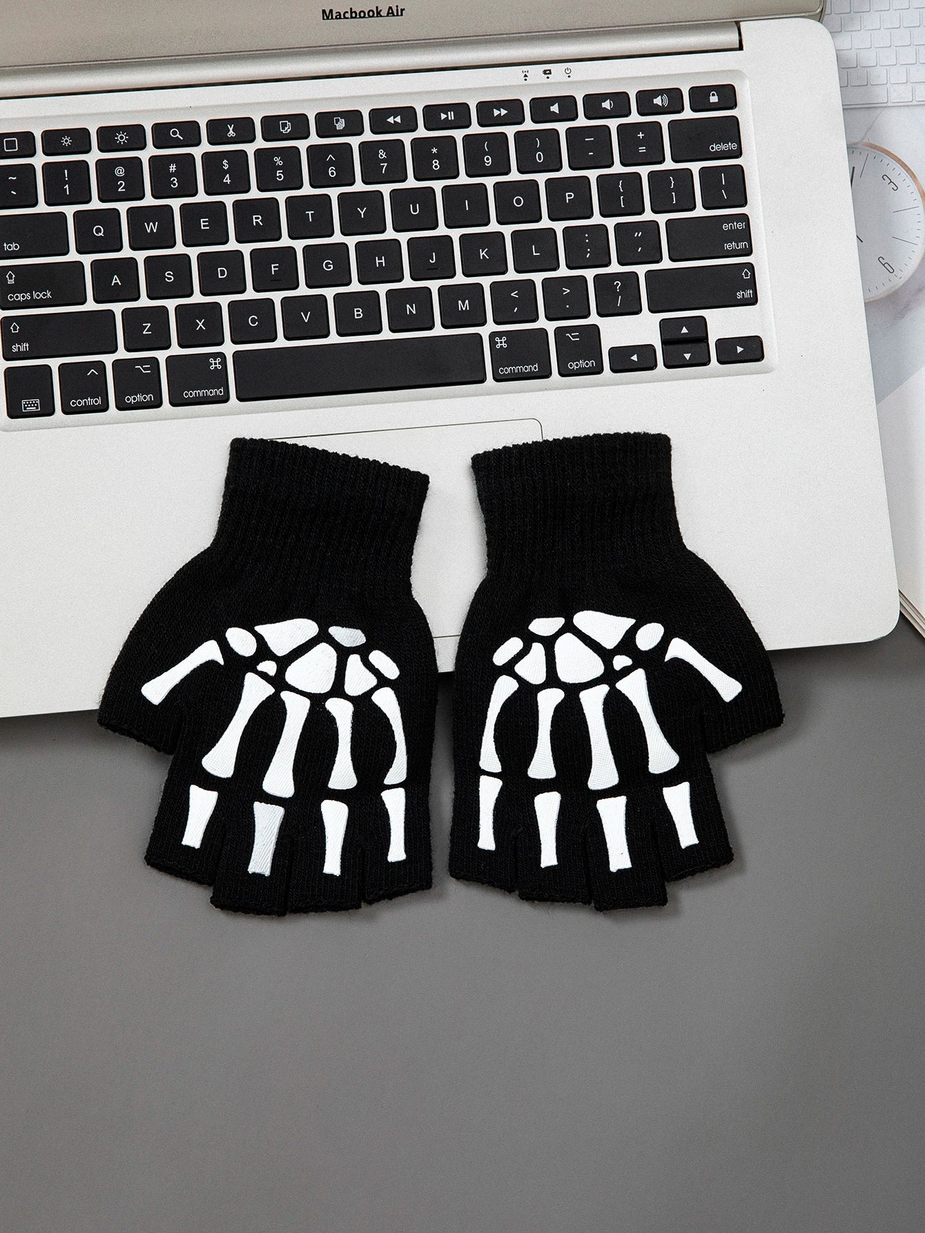 1pcs New Kids Halloween Skeleton Skull Half Finger Luminous Punk Gloves Winter Skull Fingerless Black Mitten