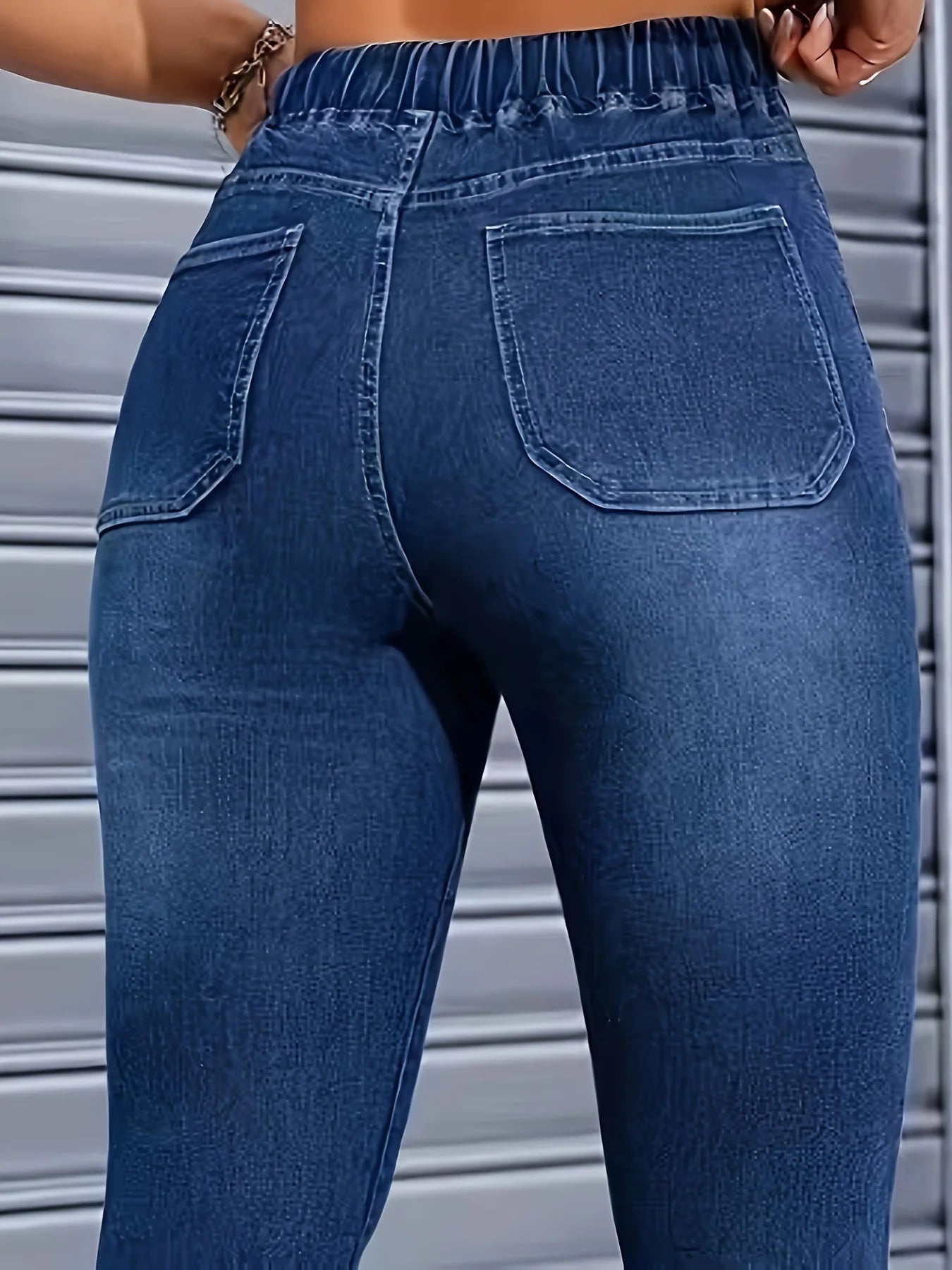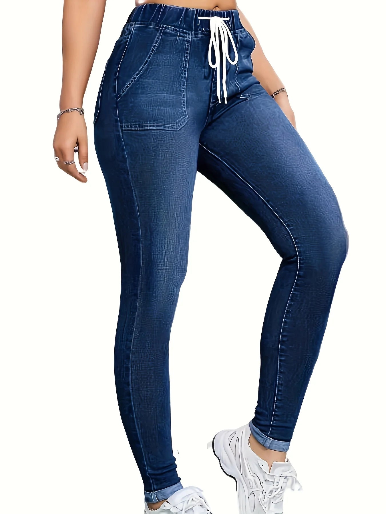 Women's high-waisted skinny jeans with drawstring waist, elastic cuffs, and slimming fit